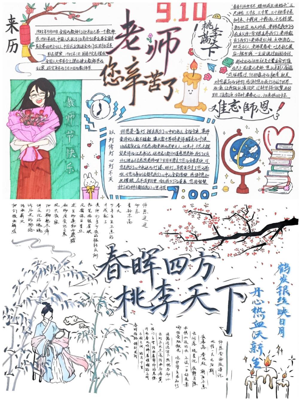 9月3日至9月8日,该院青年志愿者服务队举办以“感恩教师节”为主题的手抄报活动,同学们充分发挥自己的想象力和创造力,将手中的笔墨化为传情的使者。他们用心制作每一份手抄报,一幅幅色彩斑斓、创意无限的作品,传递了对老师深深的敬意和爱戴。