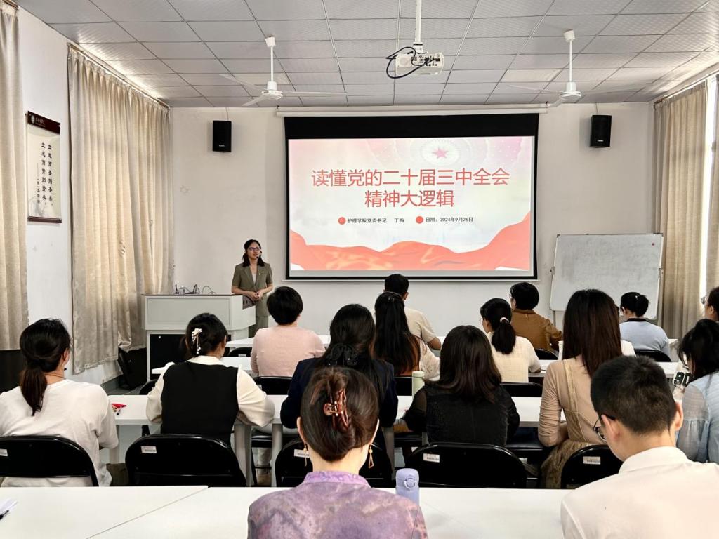 9月26日,护理学院党委书记丁梅宣讲党的二十届三中全会精神,该院全体教职工及学生党员代表到场聆听。